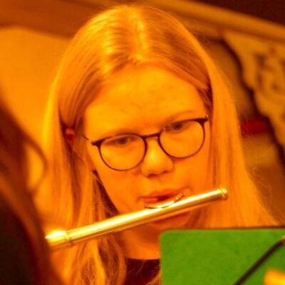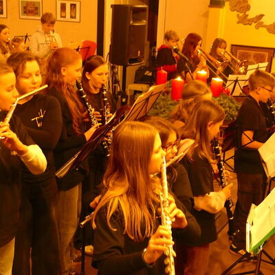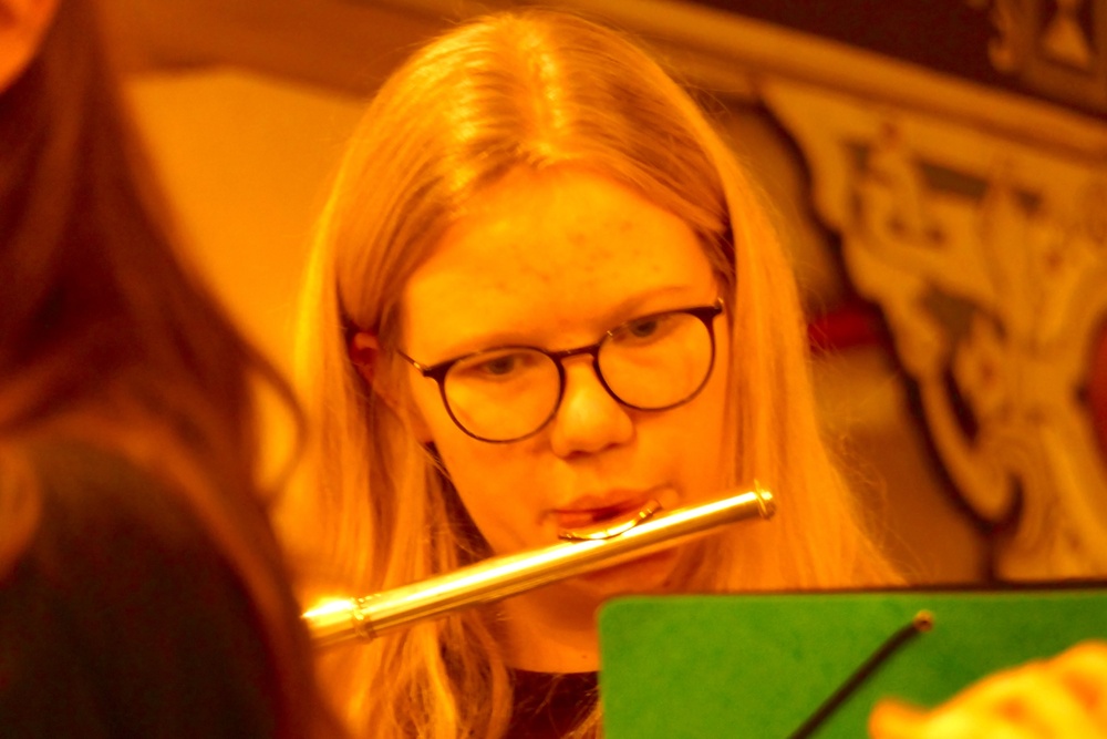 Wie es sich anhört, wenn Schülerinnen und Schüler schon etwas mehr Erfahrung am Instrument besitzen, stellte im Anschluss die Bläserklasse 6 unter der Leitung von Renate van de Voort (in Vertretung für Maren Blockhaus) unter Beweis.