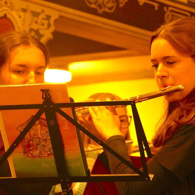 Neben dem Hören von Musik stand über den Abend verteilt auch das gemeinsame Singen traditioneller Advents- und Weihnachtslieder auf dem Programm. Holger Seifert begleitete die Gemeinde dabei souverän an der Orgel. Eine Neuerung stellte in diesem Jahr die Organisation dar, die nicht allein durch Lehrkräfte, sondern durch eine eigens dafür eingerichtete Arbeitsgemeinschaft durchgeführt wurde.