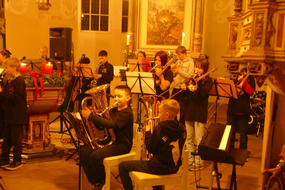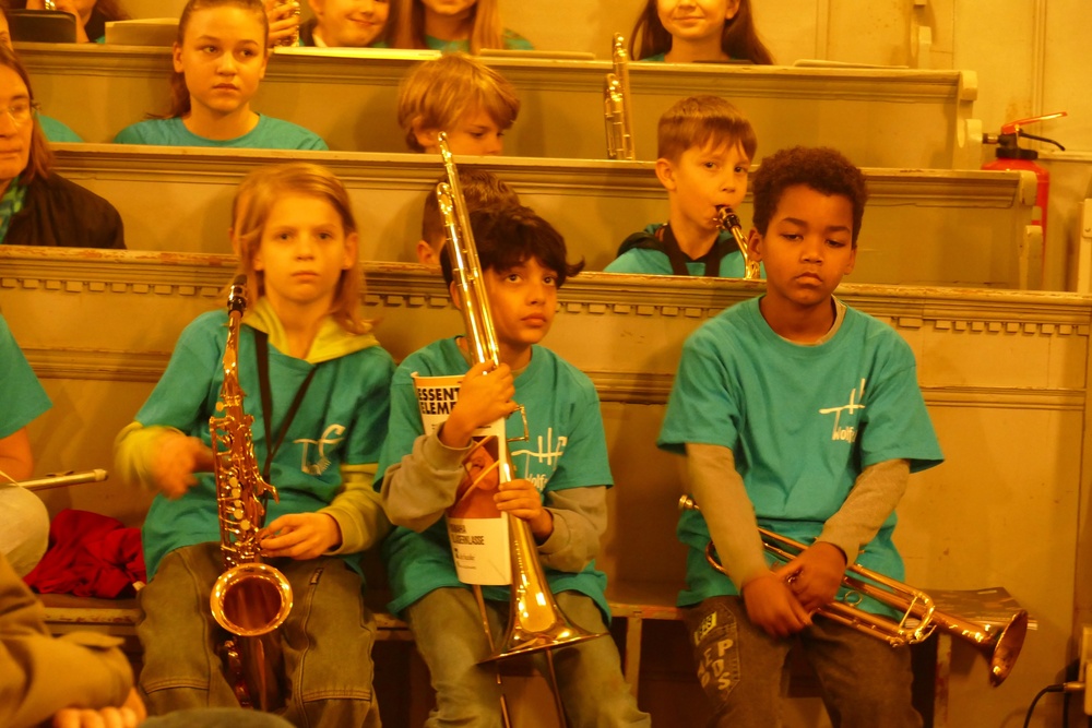Eine vertraute Tradition bildete sich schon im ersten Programmpunkt ab, in dem die Bläserklasse 5 unter der Leitung von Daniel Groneberg im Rahmen des Abends ihre ersten Töne vor Publikum spielte.
