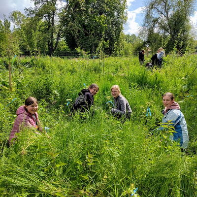Die gute Nachricht vorweg: Die Setzlinge sind im Frühjahr hervorragend angewachsen. Viele treiben mittlerweile kräftig aus, einige zeigen sogar schon erste Blüten. Damit sie sich weiterhin gut entwickeln können, durchkämmten die Schülerinnen und Schüler zunächst den Wildwuchs auf der rund halben Hektar großen Fläche, suchten nach den jungen Bäumchen und markierten sie mit blauen Schleifen. Anschließend wurde vorsichtig das umgebende Unkraut wie Brennnesseln und Brombeerranken entfernt.