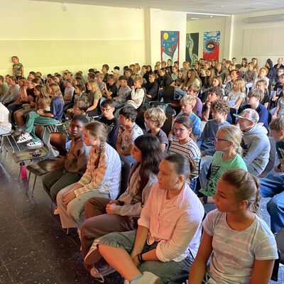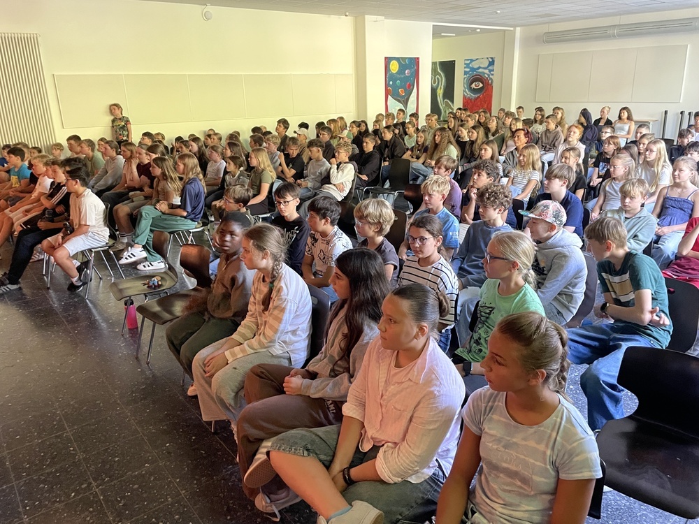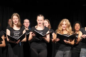 Nach dem ersten Teil mit überwiegend ruhigeren Stücken moderierten zwei Sängerinnen ein Gespräch mit der Schülerschaft. „Singt im Chor, das macht Spaß und ihr findet Freunde“, warben die beiden und plauderten aus dem Chorleben, von Fahrten, Proben und der Begeisterung für den Gesang.