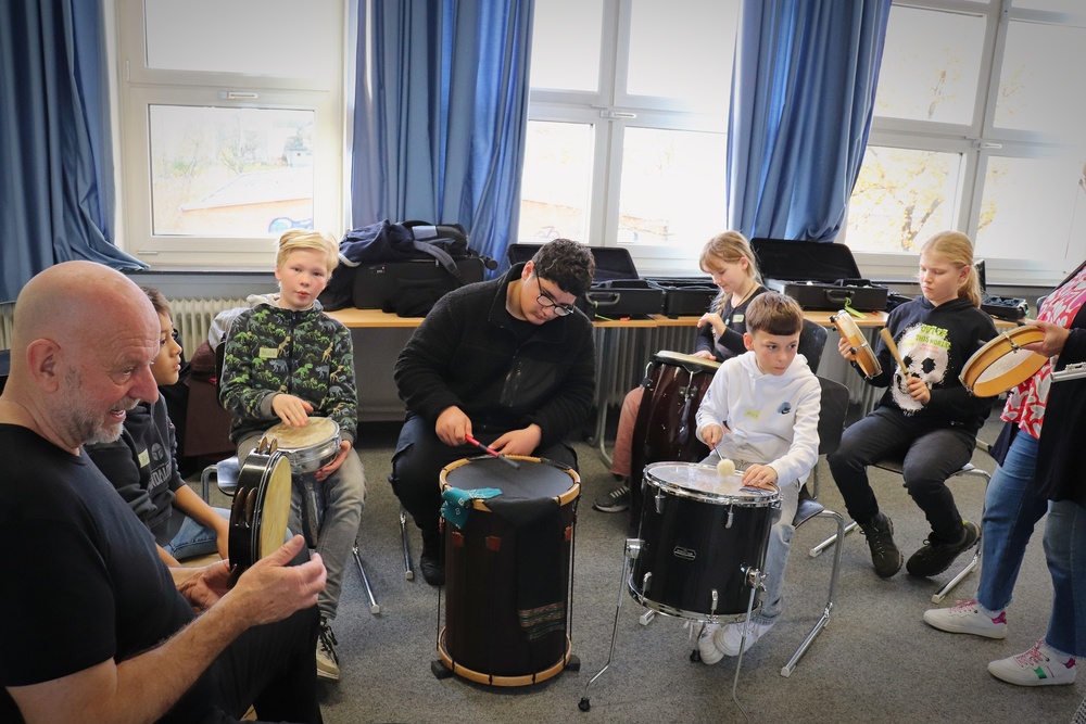 Zum Übergang in den zweiten Teil machten wir gemeinsam mit dem Trommler von Capella Rhythmusübungen, am Anfang ohne Instrumente. Wir haben dabei Beats mit unseren Füßen und Händen gemacht. Dann durften wir endlich selbst bei zwei Musikstücken von vor 500 Jahren mitspielen: Wir Schüler*innen der Bläserklasse auf unseren Instrumenten und die anderen Schüler*innen der 6b auf Trommeln. Dabei haben die Musiker von Capella de la Torre teils dirigiert, teils mit uns gespielt. Am Ende haben wir noch einmal gemeinsam Beats gemacht und Capella de la Torre hat dazu mitgespielt. Es war wirklich ein wunderbares Erlebnis für alle.