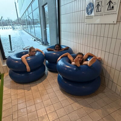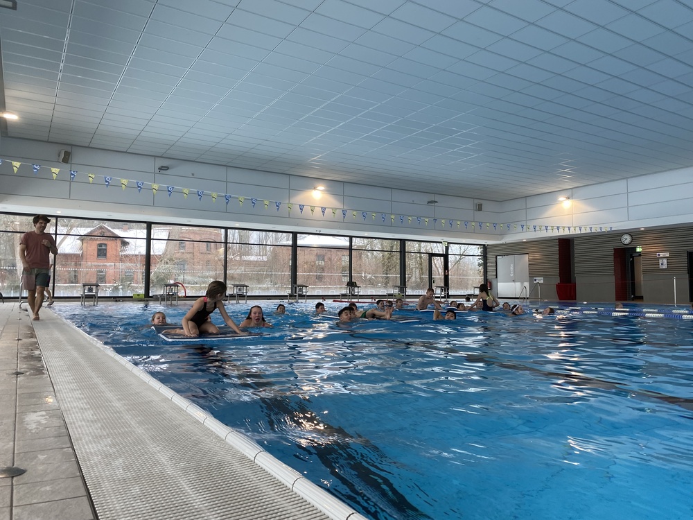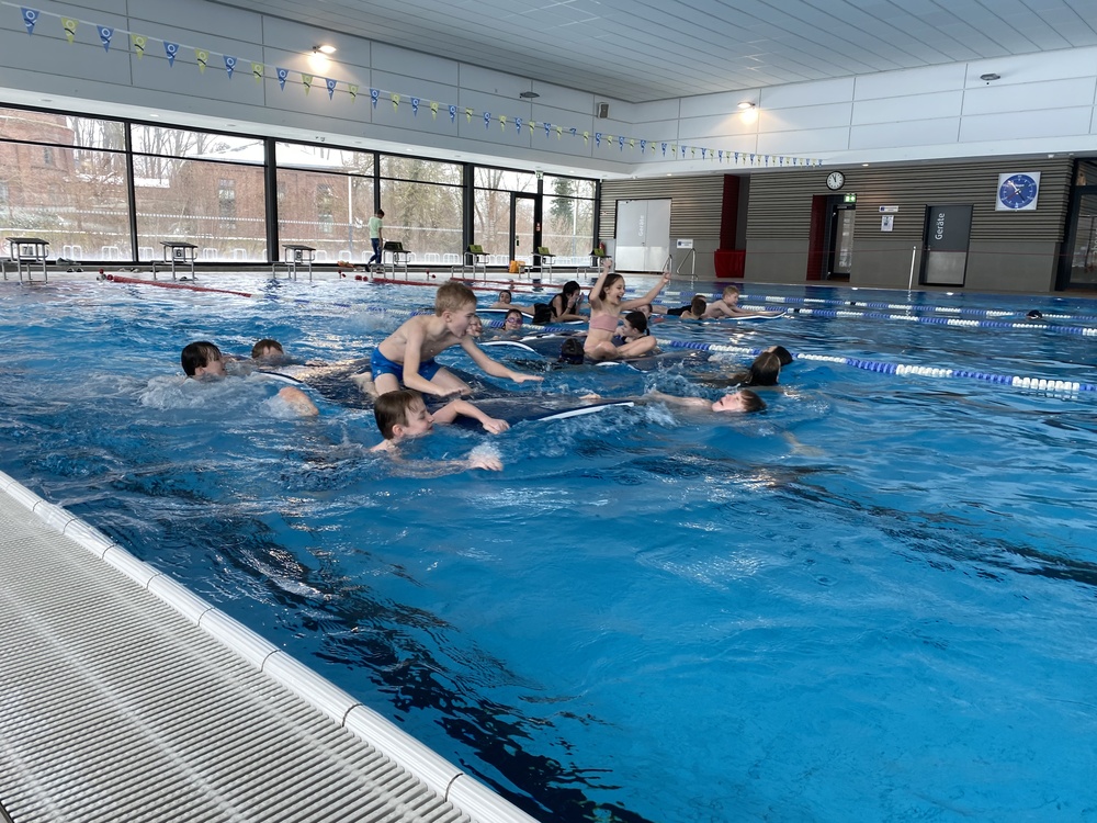 An vier verschiedenen Stationen galt es nicht nur für eine Teilleistung des Sportabzeichens schnell zu schwimmen, zu tauchen und zu rutschen, sondern auch einmal im Spaßbecken Meerjungfrauenflossen zur Fortbewegung zu nutzen. Das Schwimmfest hat allen sechsten Klassen viel Platz für vielfältige Bewegungsaufgaben und ausgiebiges Austoben nach Herzenslust im Wasser geboten.