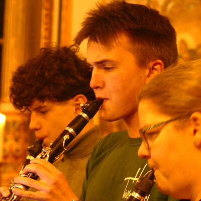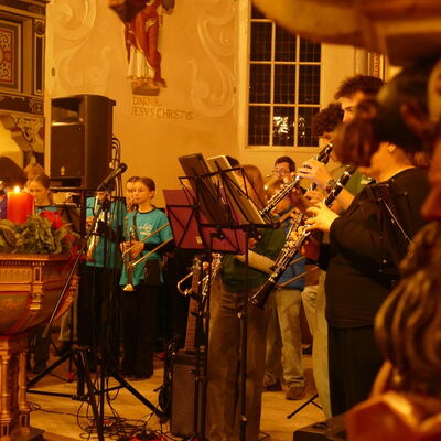 Den mitreißenden und bewegenden Abschluss des Abends bildete die Bläser-AG mit den Titeln Feather Theme (Forrest Gump), Lena's Song sowie Oh, du Fröhliche unter der Leitung von Dirk Hahn. Gesanglich unterstützt wurden sie dabei zunächst von der Solistin Mia Gradewald und abschließend von allen Anwesenden, die in das Gemeindelied einstimmten.