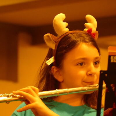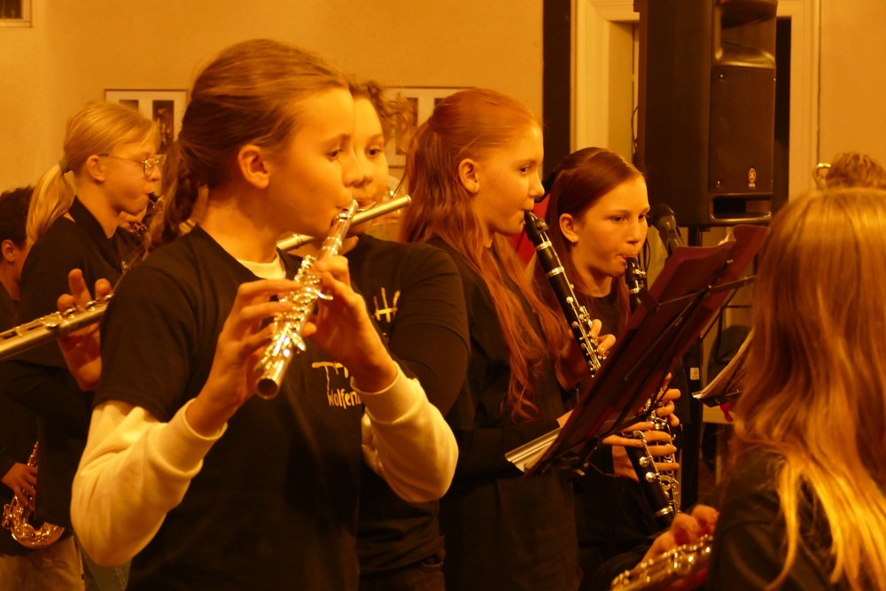 Wie es sich anhört, wenn Schülerinnen und Schüler schon etwas mehr Erfahrung am Instrument besitzen, stellte im Anschluss die Bläserklasse 6 unter der Leitung von Renate van de Voort (in Vertretung für Maren Blockhaus) unter Beweis.
