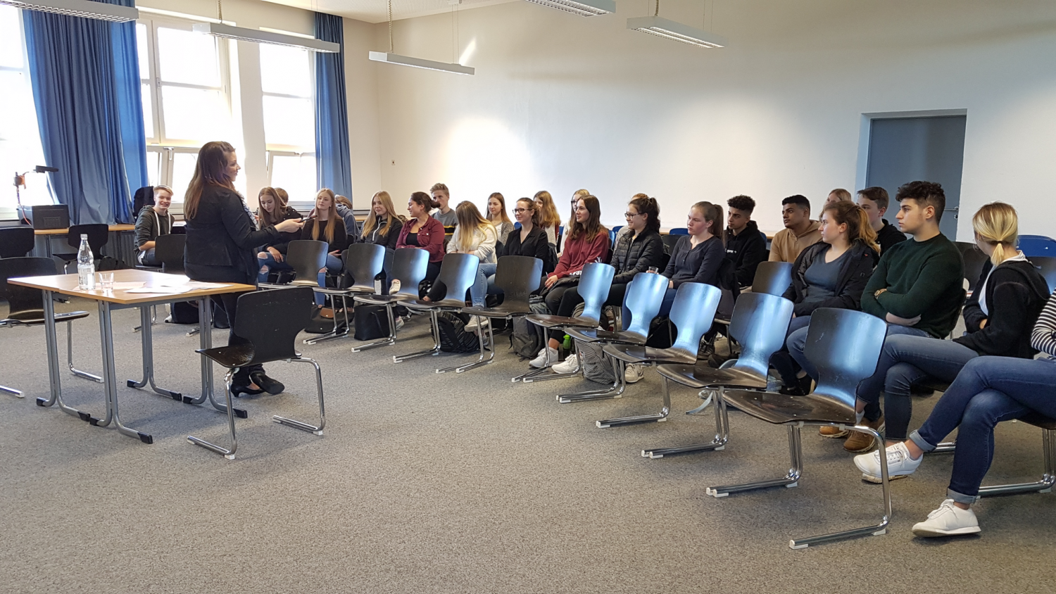 Dabei gab es auch Überraschungsmomente, z. B. als Vijdan Bangura die potenziellen Bewerber zunächst aufforderte, sich selbst im Kurzvortrag vorzustellen. Denn, so Bangura später im Plenum: „Es geht mir vorrangig darum, die Persönlichkeit des Bewerbers im Gespräch kennenzulernen.“ Damit die Selbstvorstellung nicht zu kurz gerate, empfahl sie den Schülerinnen und Schülern, sich ausgehend von Freizeitaktivitäten zunächst ihre wichtigsten Fähigkeiten und Eigenschaften (Skills) bewusst zu machen, die dann dann im Vortrag ausgeführt werden können. Wer hier übertreibe und nicht bei der Wahrheit bliebe, würde allerdings schnell auffliegen. Vielmehr sei Authentizität gefragt. Dies gelte auch für die Kleidung und das Auftreten. Angemessen seien Stoffhose, dazu Hemd oder Bluse, für die Mädchen evtl. ein Blazer. Die Bewerber sollten sich wohl fühlten und nicht „verkleidet“ vorkommen. No-gos im Gespräch seien eine zu lässige Sitzhaltung, dem Gesprächspartner ins Wort zu fallen oder Blickkontakt zu vermeiden. Dies werde schnell als Desinteresse ausgelegt. Punkten könne ein Bewerber, wenn er sich vorher gut über das Unternehmen informiert und selbst eine oder zwei Fragen parat habe.