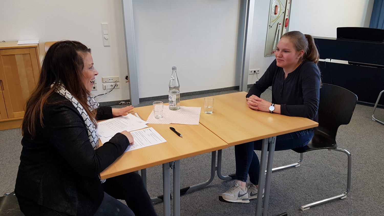 Im Zentrum des Bewerbungstrainings stand die Simulation des Bewerbungsgespräches. Mattis Faber und Ida Hamann hatten sich als Freiwillige zur Verfügung gestellt. Ihre anfängliche Nervosität legten beide schnell ab, so dass sich ein intensives Gespräch in angenehmer Atmosphäre entwickeln konnte.