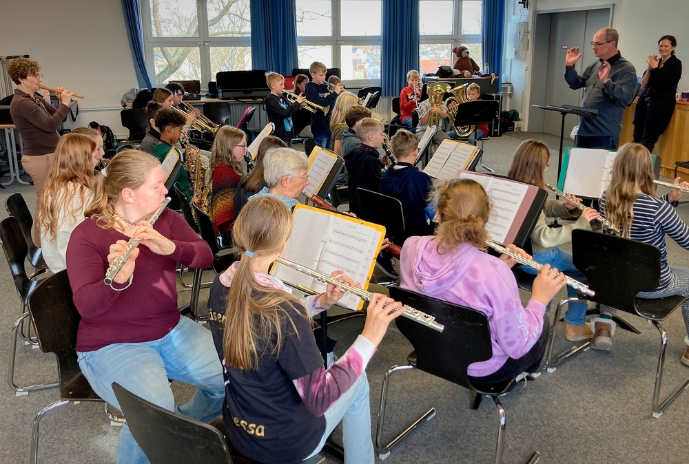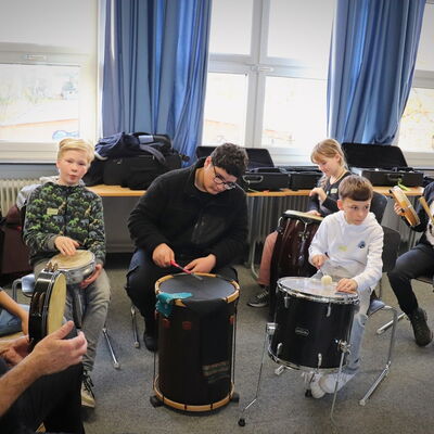 Zum Übergang in den zweiten Teil machten wir gemeinsam mit dem Trommler von Capella Rhythmusübungen, am Anfang ohne Instrumente. Wir haben dabei Beats mit unseren Füßen und Händen gemacht. Dann durften wir endlich selbst bei zwei Musikstücken von vor 500 Jahren mitspielen: Wir Schüler*innen der Bläserklasse auf unseren Instrumenten und die anderen Schüler*innen der 6b auf Trommeln. Dabei haben die Musiker von Capella de la Torre teils dirigiert, teils mit uns gespielt. Am Ende haben wir noch einmal gemeinsam Beats gemacht und Capella de la Torre hat dazu mitgespielt. Es war wirklich ein wunderbares Erlebnis für alle.