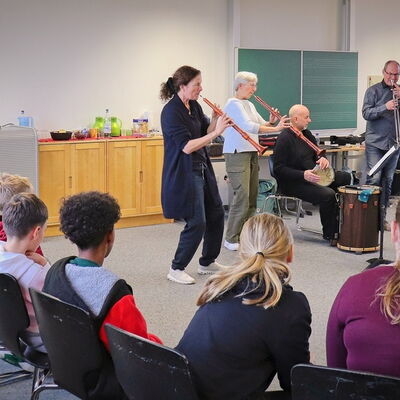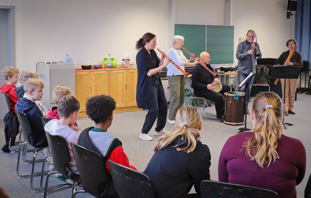 Projekt „Zeitmaschine“: Das Ensemble „Capella de la Torre“ spielt vor und musiziert gemeinsam mit der Klasse 6b