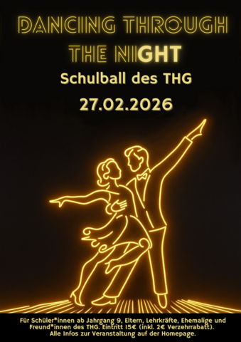 Der Event-Countdown läuft! Nach zweijähriger Pause ist es am 27.2.2026 endlich wieder soweit: Das THG lädt unter dem Motto „Dancing through the niGHT“ wieder zu seinem traditionellen Schulball ein.