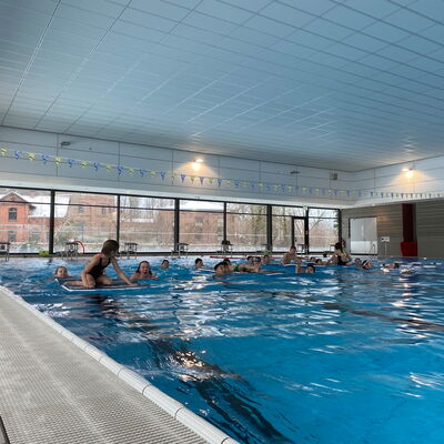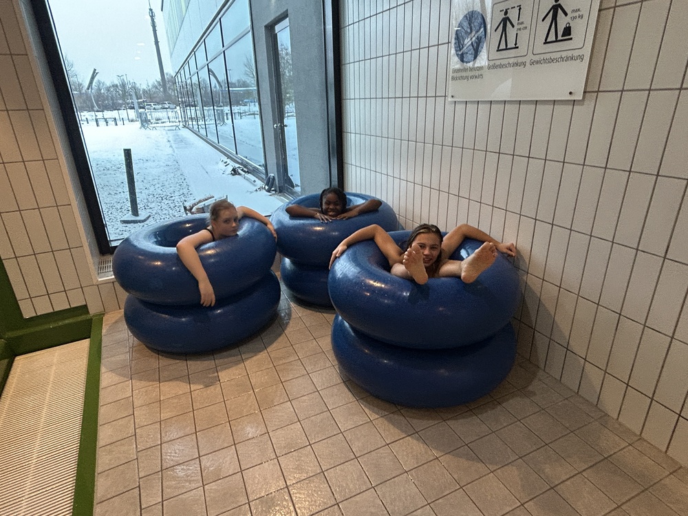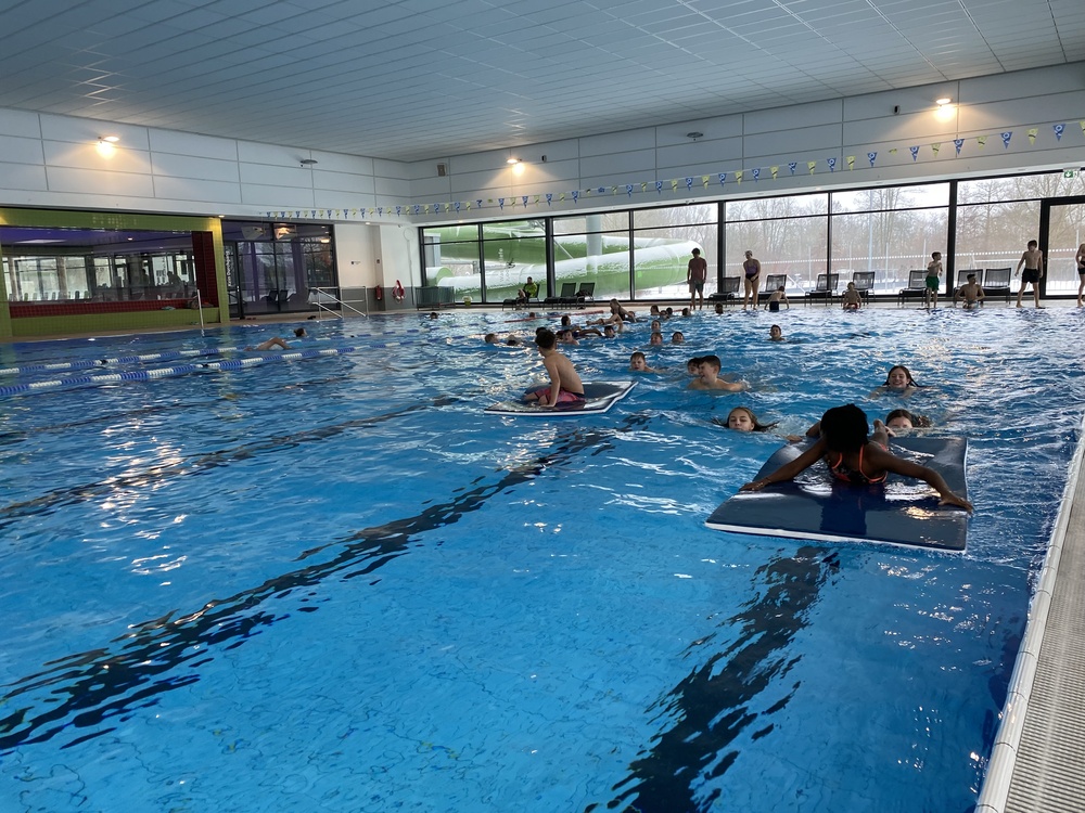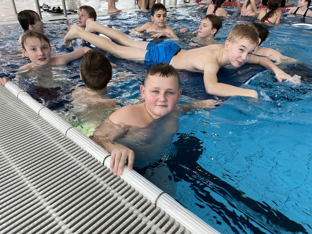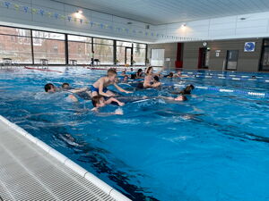 An vier verschiedenen Stationen galt es nicht nur für eine Teilleistung des Sportabzeichens schnell zu schwimmen, zu tauchen und zu rutschen, sondern auch einmal im Spaßbecken Meerjungfrauenflossen zur Fortbewegung zu nutzen. Das Schwimmfest hat allen sechsten Klassen viel Platz für vielfältige Bewegungsaufgaben und ausgiebiges Austoben nach Herzenslust im Wasser geboten.