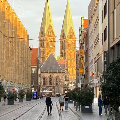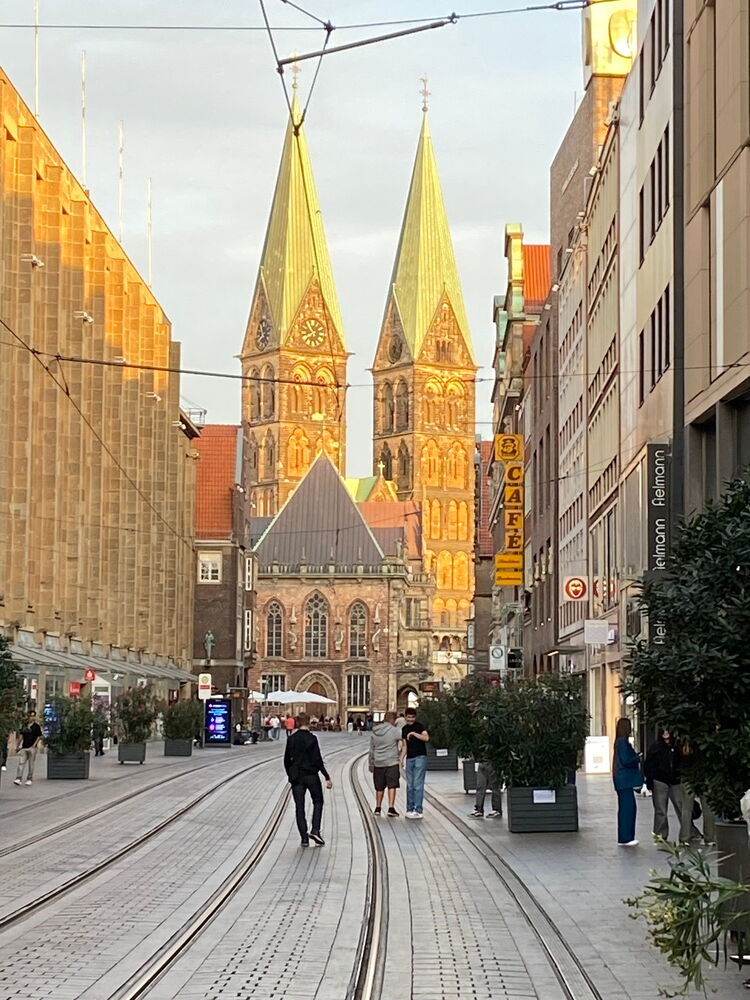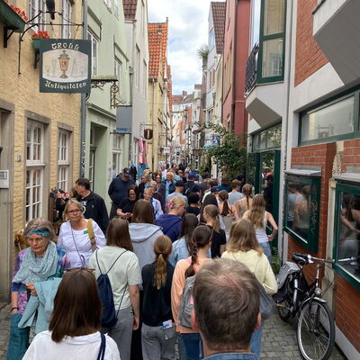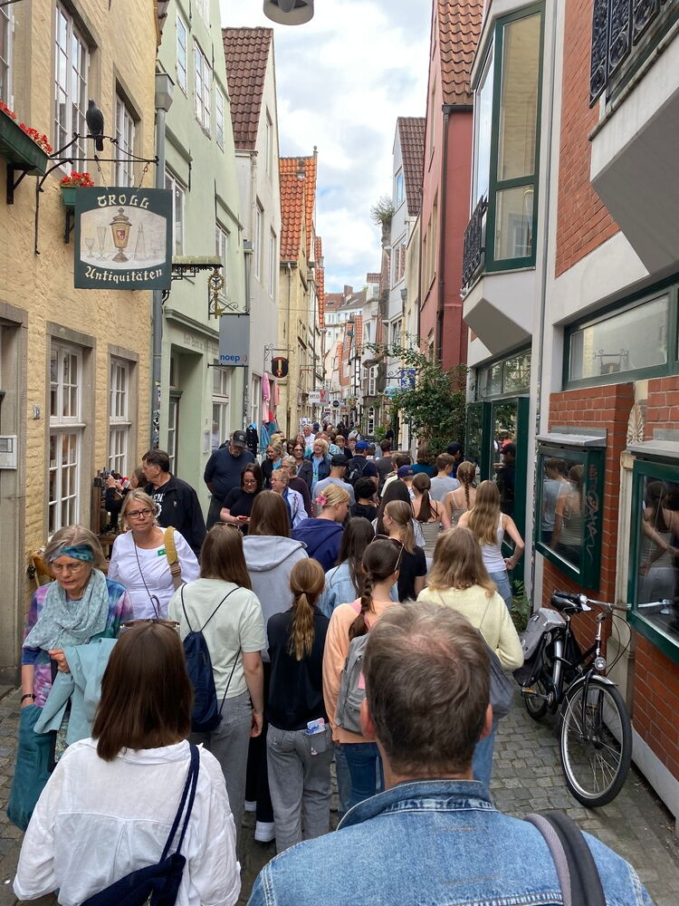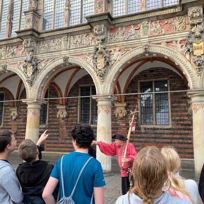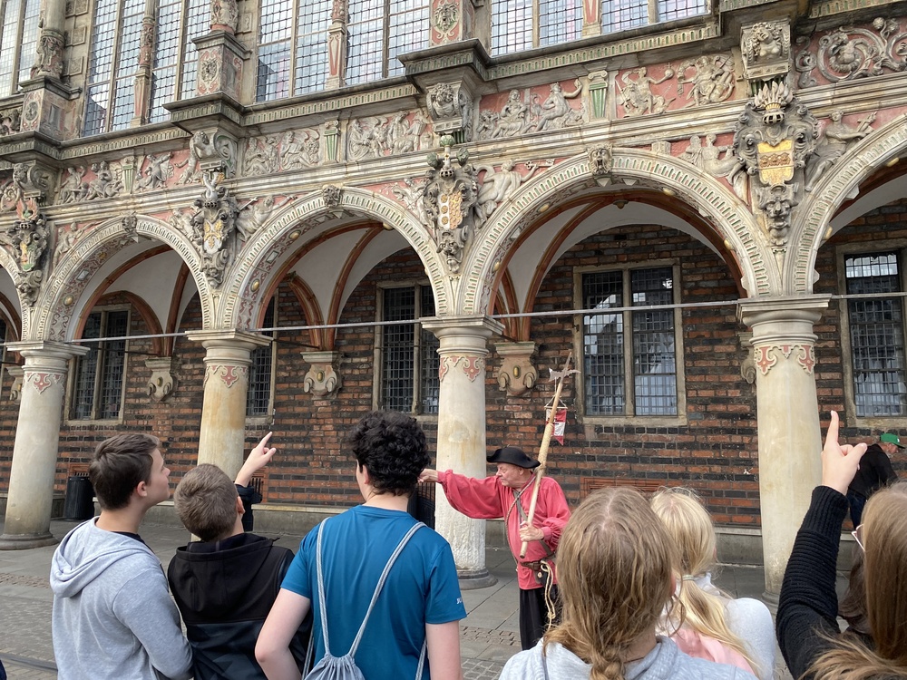 Da beide Klassen unterschiedliche Termine für die Programmpunkte hatten, konnten wir Bremen schon mal ein wenig in Kleingruppen erkunden und hatten Zeit, um die Bremer Stadtmusikanten zu fotografieren oder ein Eis zu essen, während die 8c an einer Stadtführung teilnahm. Statt dieser Stadtführung haben wir uns am Montagabend auf eine besondere Tour begeben: Von den Bremer Stadtmusikanten, weiter zum Spuckstein vor dem Dom und dann in den Schnoor führte uns ein Nachtwächter, der uns das Gefühl gab, sich im mittelalterlichen Bremen zu befinden. Dazu trugen auch die Straßenbahnen bei, welche von dem Nachtwächter scherzhaft „Lindwürmer“ genannt wurden.