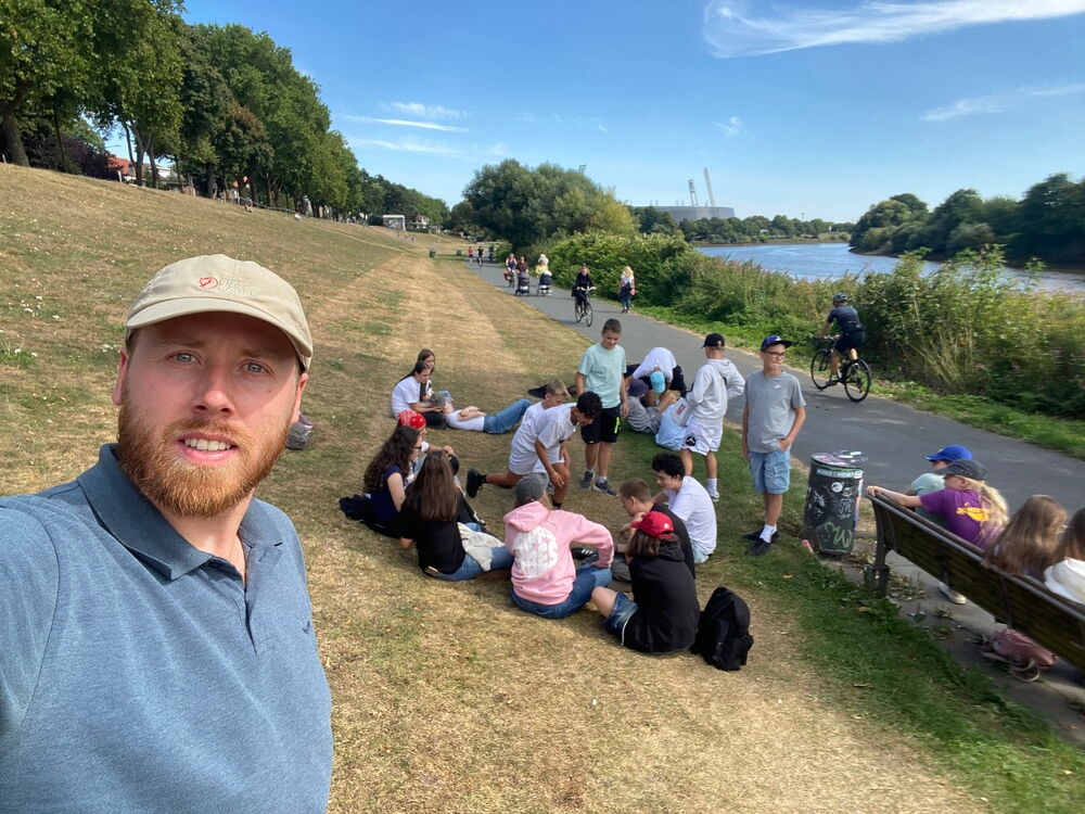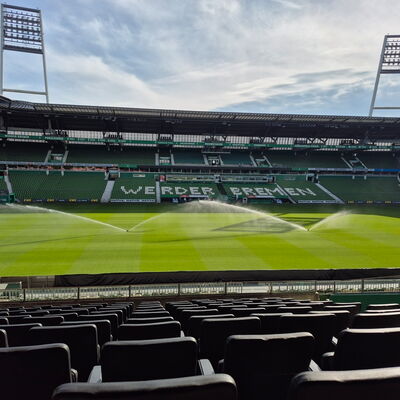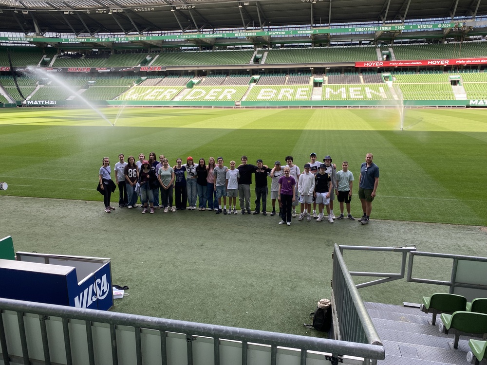 Nach diesem aufregenden Tag ging es am nächsten Morgen dann entspannt mit einer Hafenrundfahrt weiter. Da wir danach noch gute zwei Stunden bis zur Besichtigung des Weserstadions hatten, machten wir es uns im Schatten eines Baumes gemütlich, um unser Lunchpaket nach dem kleinen, gemeinsamen Spaziergang durch das Viertel, im Osterpark an der Weser zu essen. Das Stadion und sein „Wuseum“ faszinierte natürlich besonders diejenigen, die gerne Fußball spielen oder sich dafür interessieren, aber auch die meisten anderen meinten hinterher, dass es toll war, mal ein Stadion von innen gesehen zu haben.
